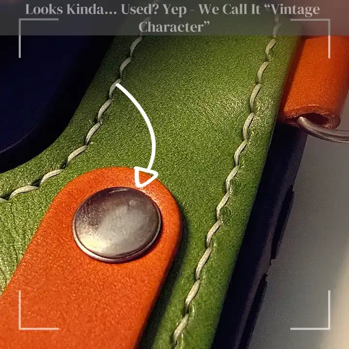 Somewhere above the case looks a bit old? Nope, this is the charm of handcrafted. Our genuine leather is raw and rugged. The rivets are hammered in one by one by hand. There might be tiny marks or dings. But it’s solid, sturdy, and full of character. Not worn out - just vintage on purpose.
